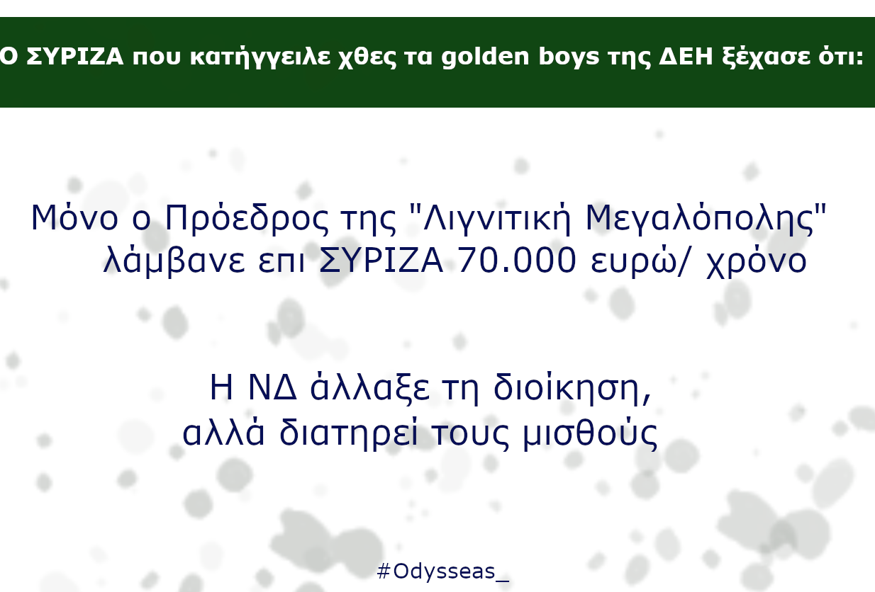 –       Άκουσα επίσης τους συναδέλφους του ΣΥΡΙΖΑ να μιλούν γιακατασπατάληση χρήματος και για golden boys. Στη “Λιγνιτική Μεγαλόπολης Α.Ε.”, ο ΣΥΡΙΖΑ διόρισε συνδικαλιστικό στέλεχός του με 4.630 ευρώ το μήνα. Μάλιστα εκτός από αυτό τα μέλη του Διοικητικού Συμβουλίου λάμβαναν 400 ευρώ για κάθε συνεδρίαση και έχουν γίνει 19 επιτροπές σε ένα χρόνο (περίπου 70.000 ευρώ το χρόνο η μισθοδοσία του προέδρου). Αυτά είναι τα golden boys κύριοι συνάδελφοι. Ρωτώ τη ΝΔ, τι θα κάνει; Θα συνεχίσει να τα συντηρεί με τις νέες διοικήσεις;